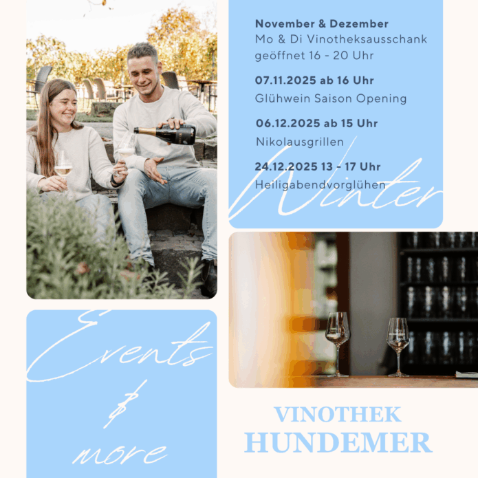 Winteröffnungszeiten im Vinotheksausschank & Events Veröffentlicht am 29. Oktober 2025 | 16:54| Keine Kommentare Der Weinverkauf bleibt wie gewohnt geöffnet.