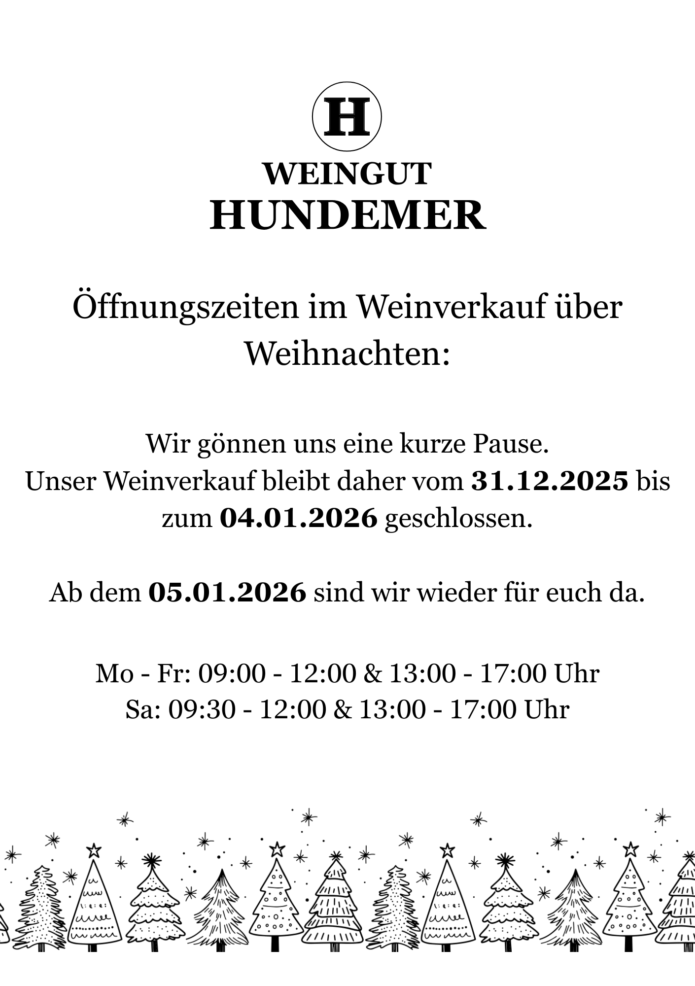 Unser Weinverkauf bleibt daher vom 31.12.2025 bis zum 04.01.2026 geschlossen.